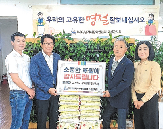 고성군장애인후원회(회장 하학열)가 추석을 맞아 어려운 이웃과 온정을 나눴다. 지난 9월 26일 (사)경남지체장애인협회 고성군지회 사무실에서 열린 전달식에서 후원회는 고성군 내 장애인단체와 시설에 500만원 상당의 상품권을 전달했다. 이번 후원품은 정점식 국회의원과 50여 명의 회원들이 회비를 모아 마련했다. 고성군장애인후원회는 설과 추석마다 꾸준히 장애인 가정을 위로하고 후원을 이어오며 지역사회 나눔 문화 확산에 앞장서 왔다. 하학열 회장은 “우리 주변에는 여전히 따뜻한 손길이 필요한 이웃이 많다”며 “명절의 의미를 되새기고 풍요로운 한가위를 보내길 기원한다. 앞으로도 지속적인 나눔 봉사로 소외된 이웃을 위해 힘쓰겠다”고 말했다.