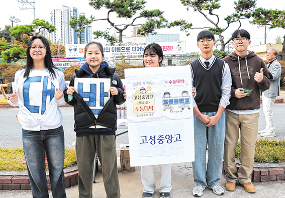 | ↑↑ 고성중앙고 학생들이 수능을 치르는 선배들을 응원하고 있다. |
