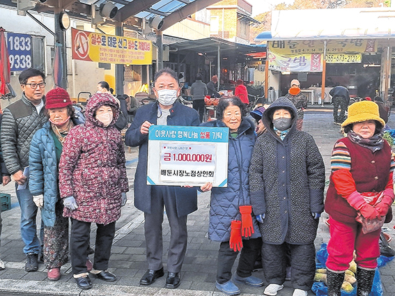 회화면은 지난 7일 배둔시장 노점상인회(회장 김윤헌)가 새해를 맞아 지역의 어려운 이웃을 위해 성금 100만 원을 기탁했다고 밝혔다. 이번 성금은 배둔시장 노점상인들이 십시일반 마음을 모아 마련한 것으로, 경남사회복지공동모금회를 통해 회화면 관내 저소득층 가구와 독거노인 등 형편이 어려운 이웃과 복지사각지대 대상자에게 지원될 예정이다. 김윤헌 배둔시장 노점상인회장은 “회화면민들이 시장을 꾸준히 찾아주신 덕분에 배둔시장이 유지될 수 있었다”라며 “노점 상인들 역시 넉넉하지 않은 형편이지만, 우리보다 더 어려운 이웃들에게 도움이 되길 바라는 마음으로 성금을 마련했다”라고 말했다.
