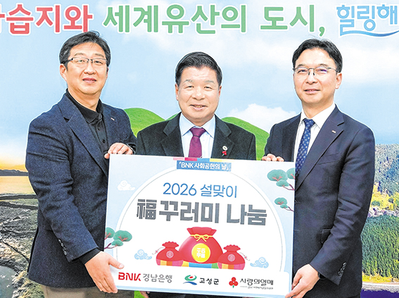 BNK경남은행 서부영업그룹 임재문 부행장은 지난 26일 고성군청을 방문해 450만원 상당의 ‘설날맞이 복꾸러미’ 식료품 세트 100박스를 전달했다. 이번에 기탁된 복꾸러미는 부침가루, 고추장, 라면, 참치캔 등 식료품 18종으로 구성됐으며, 명절을 맞아 생계에 어려움을 겪는 가정에 실질적인 도움이 될 수 있도록 마련됐다. 임재문 부행장은 “설 명절을 앞두고 소외된 이웃들이 조금이나마 따뜻한 명절을 보내는 데 보탬이 되길 바란다”라며 “앞으로도 지역사회와 함께하는 나눔 활동을 꾸준히 이어가겠다”고 말했다. |
