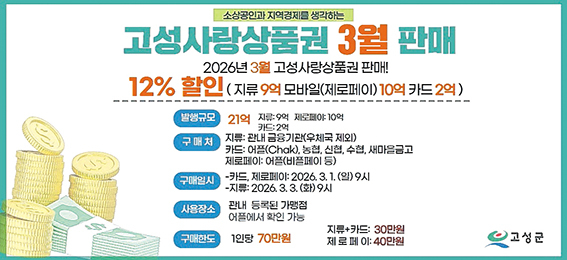 고성군은 2026년 정부의 지역사랑상품권 발행 지원 사업 확대에 맞춰 고성사랑상품권 할인율을 연중 12%로 상향한다고 밝혔다. 정부가 올해 지역사랑상품권 발행 지원 사업 국비를 확대함에 따라 군은 군민 지원 강화를 결정했다. 오는 3월 발행분 21억원부터 고성사랑상품권 지류형, 모바일형, 카드형 전 유형에 12% 할인율을 적용한다. 구매는 3월 1일 오전 9시부터 제로페이와 금융기관 어플, 지역사랑상품권 ‘chak’ 어플에서 모바일형과 카드형을 구매할 수 있다. 3월 3일 오전 9시부터는 관내 금융기관에서 지류형을 구매할 수 있다. 우체국은 제외한다. 선착순 판매로 당월 발행액을 초과하면 판매를 종료한다. 군은 그동안 연중 10% 상시 할인으로 상품권을 운영해왔다. 지난 2월 설 명절을 맞아 한시적으로 시행한 12% 특별 할인은 큰 호응을 얻으며 지역 내 소비 활성화 효과를 보였다. 이주열 경제기업과장은 “고성사랑상품권이 지역경제를 살리는 든든한 마중물이 되도록 안정적인 발행과 운영에 힘쓰겠다”라면서 “앞으로도 군민이 체감할 수 있는 실질적인 지원 정책을 지속적으로 확대해 나가겠다”라고 밝혔다. |