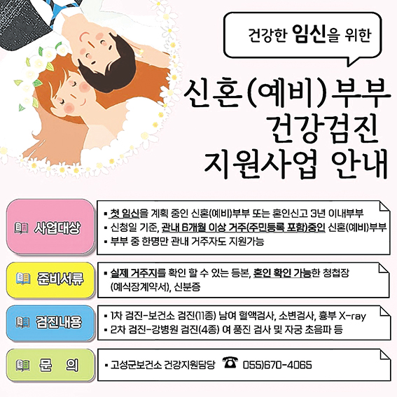 고성군은 첫 임신을 계획하는 신혼부부와 예비부부를 대상으로 무료 건강검진을 지원하고 있다. 2021년 7월부터 혼인신고 3년 이내 부부 또는 예비부부를 대상으로 운영해 왔다. 신청일 기준 6개월 전부터 부부 중 한 명 이상이 고성군에 주민등록을 두고 실제 거주하면 지원받을 수 있다. 주민등록등본과 혼인 사실을 확인할 수 있는 청첩장이나 예식장 계약서, 신분증을 지참해 보건소를 방문하면 된다. 검진은 1차와 2차로 나눠 진행한다. 1차는 고성군보건소에서 부부를 대상으로 혈액검사 등 11개 항목을 검사한다. 2차는 관내 산부인과 강병원에서 여성을 대상으로 풍진검사와 자궁 초음파 등 4개 항목을 추가로 진행한다. 이을희 보건소장은 “임신 전 필수검사를 통해 난임과 유산 위험 요인을 미리 확인하고 관리하도록 돕겠다”며 “건강한 임신과 출산을 지원하는 데 힘쓰겠다”고 말했다. 자세한 사항은 고성군보건소 건강증진과(670-4065)로 문의하면 된다.
